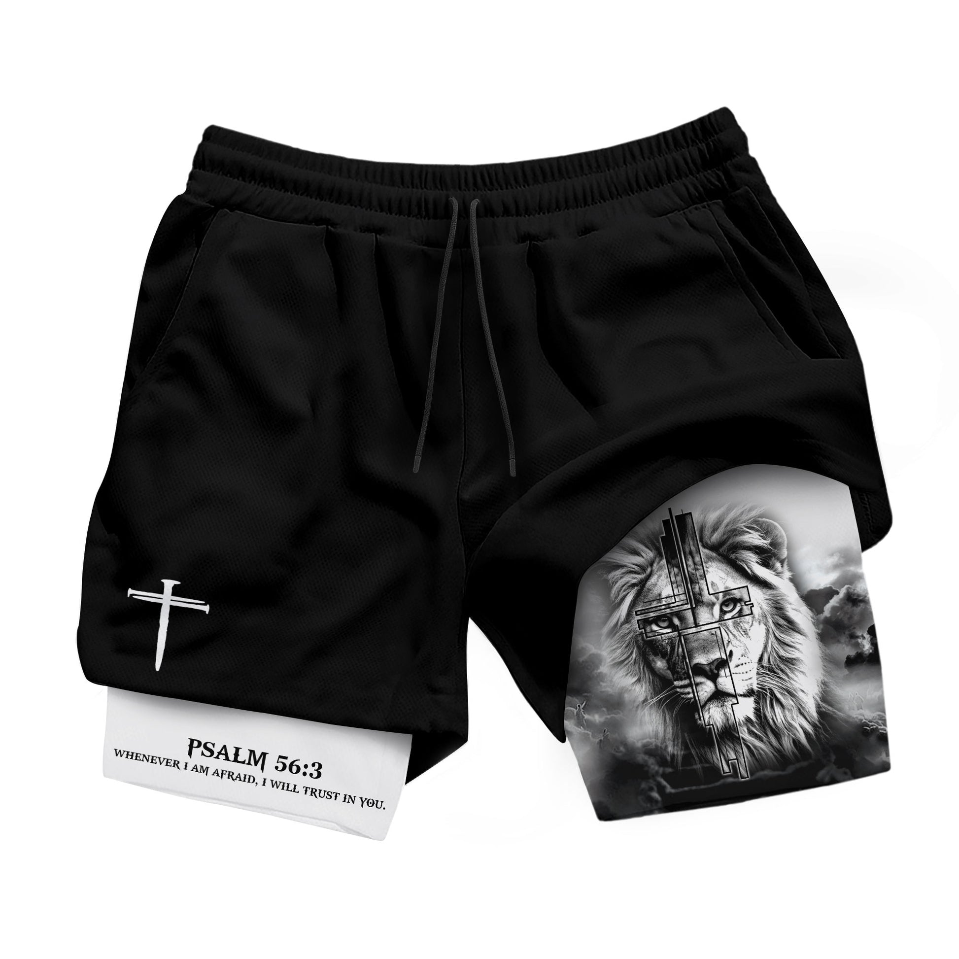 Christian gym shorts featuring Psalm 56 3 lion cross design A bold reminder to trust in God and stay strong in faith