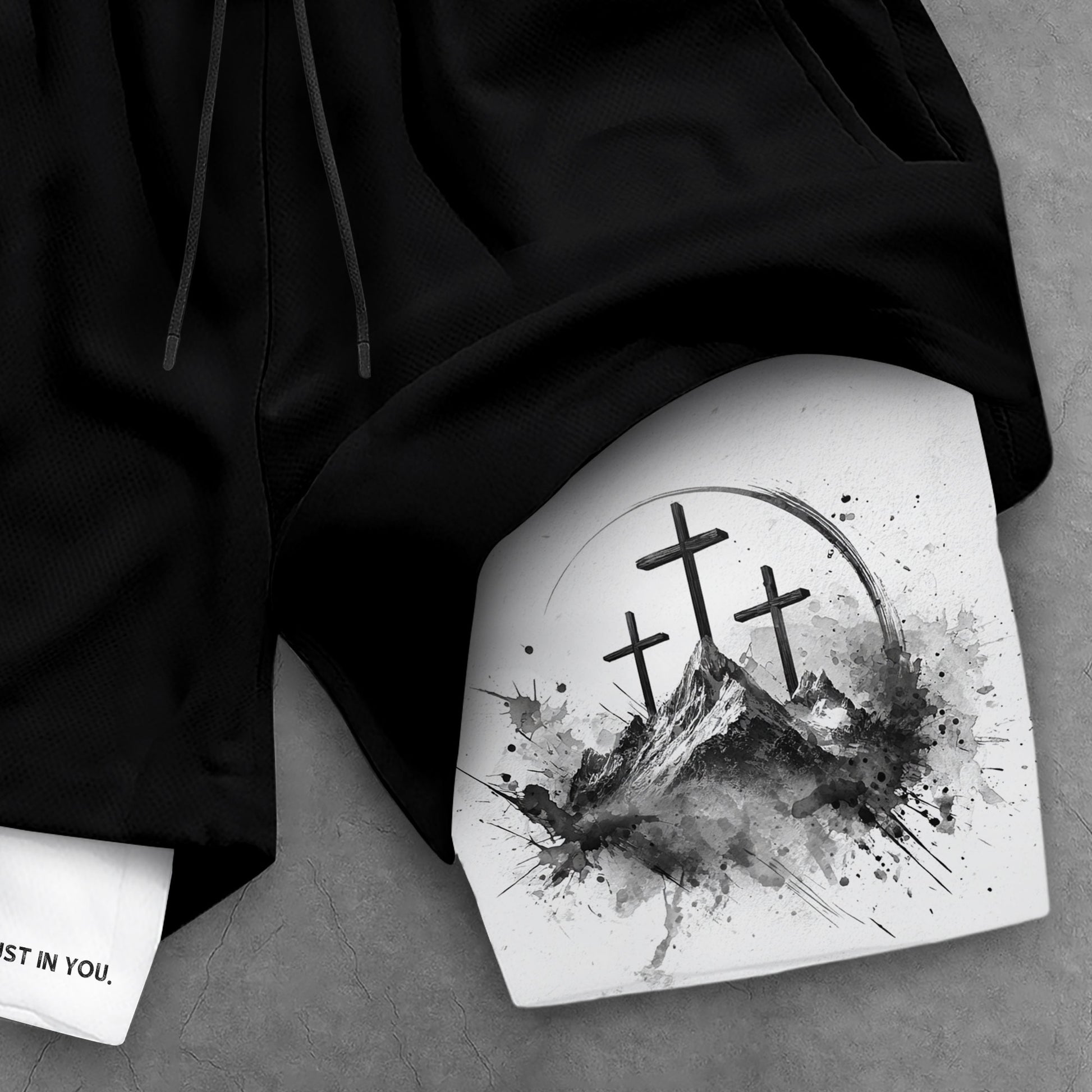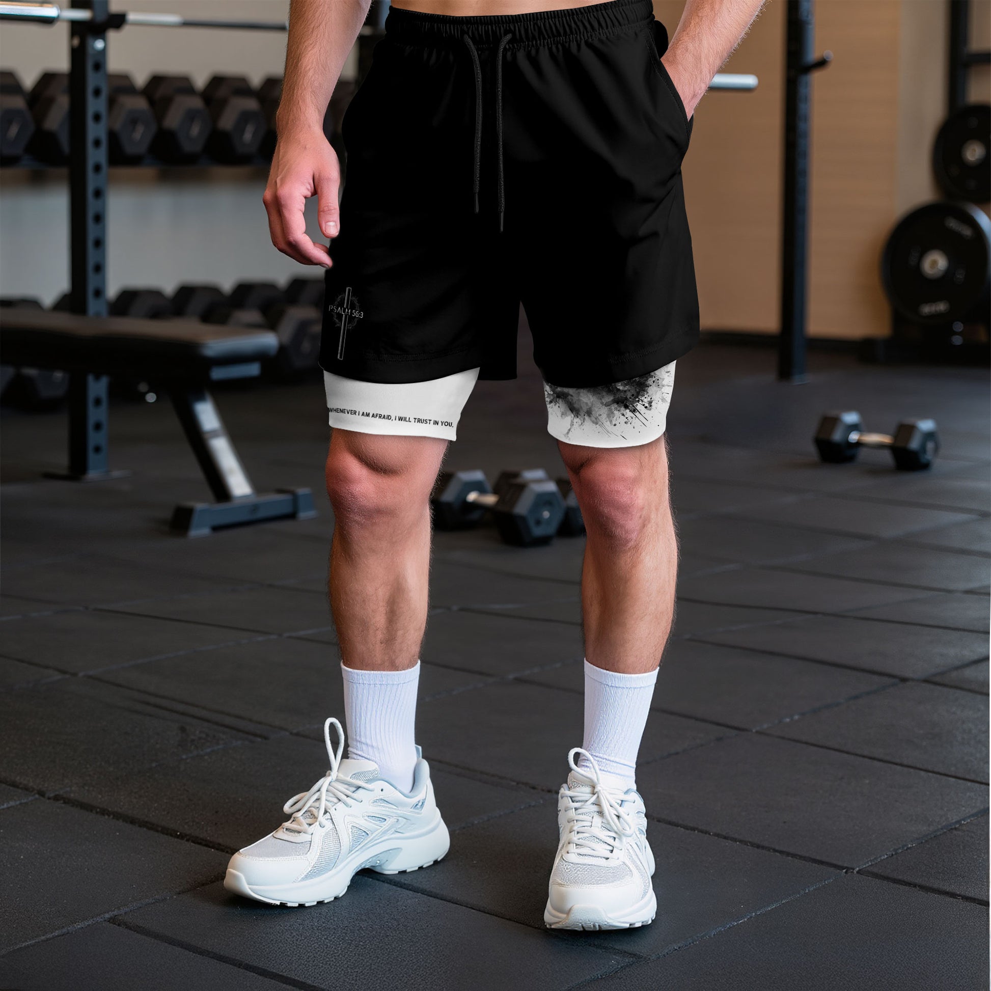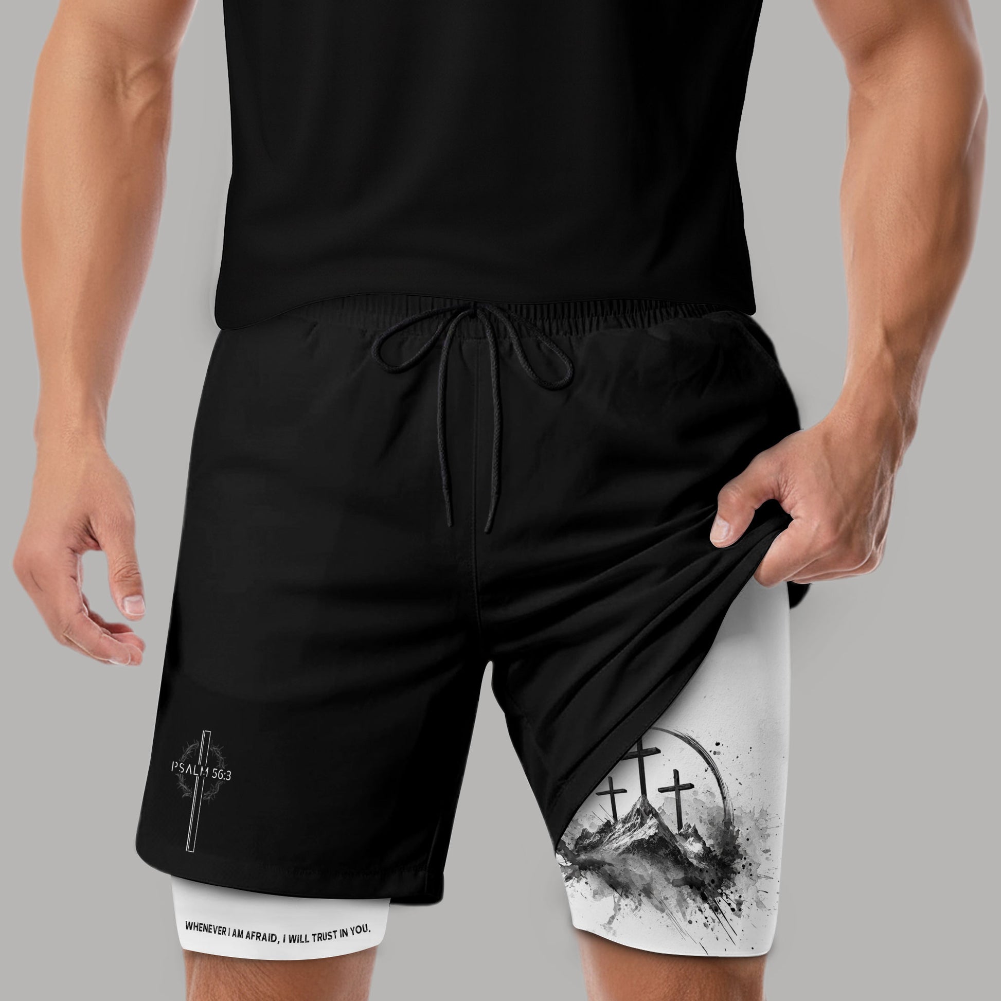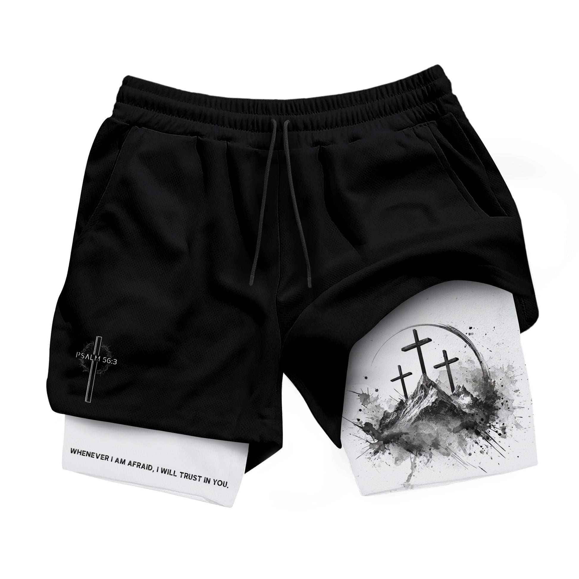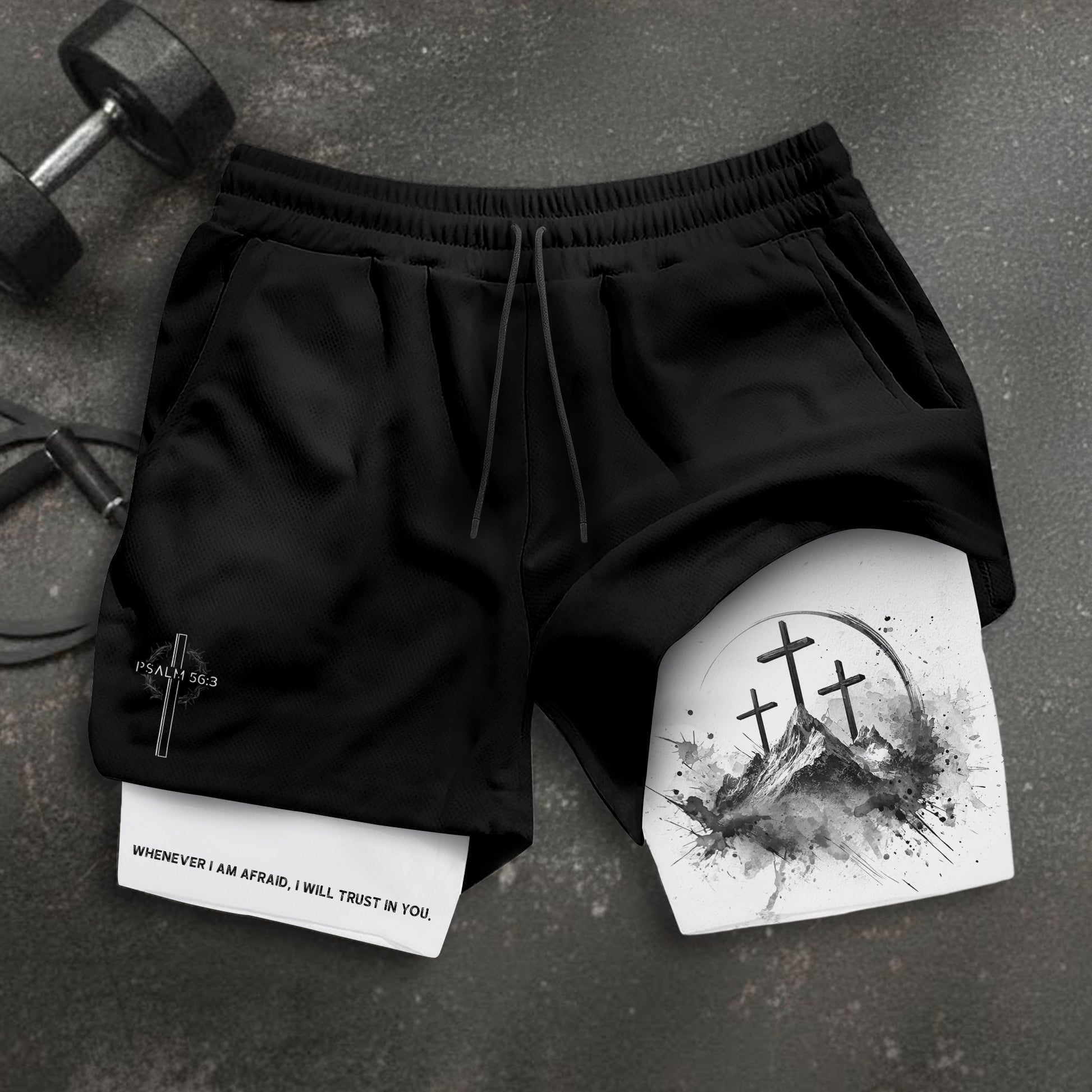 Christian gym shorts with three crosses design inspired by Psalm 56 3 A reminder to trust God over fear