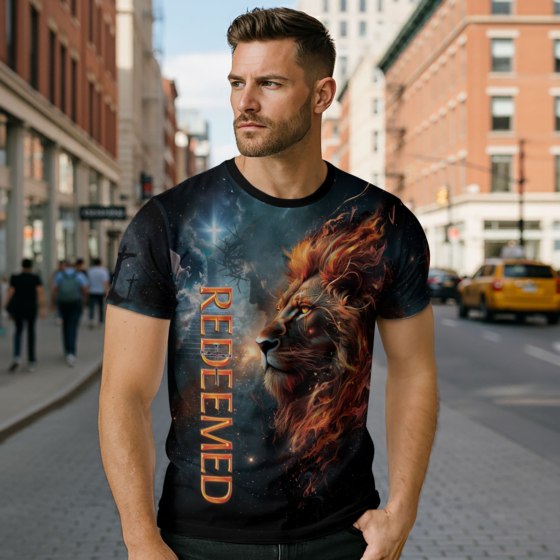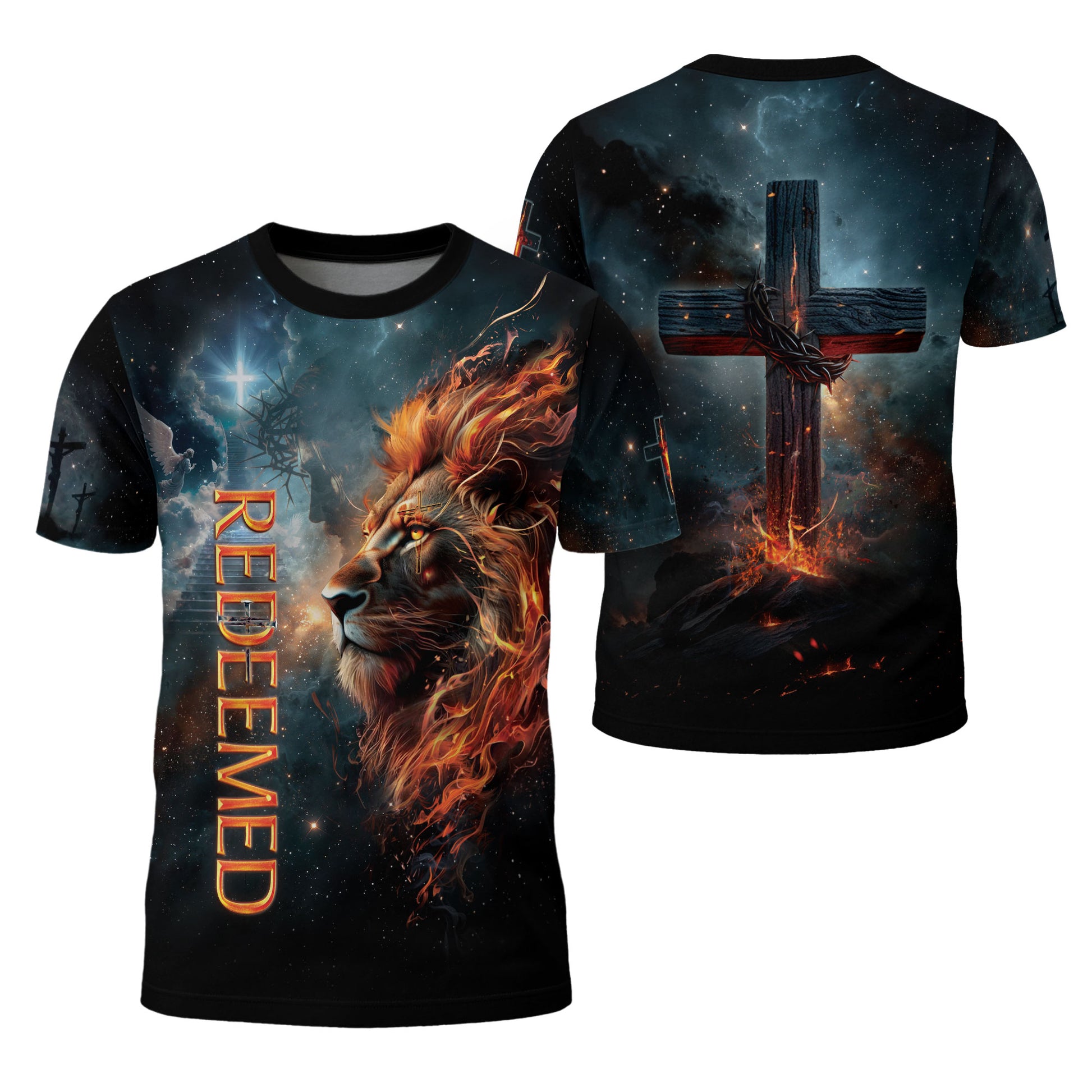 Christian T-Shirt with a fiery lion and glowing cross symbolizing redemption and faith in Christ. Bold Redeemed design with cosmic fire background.