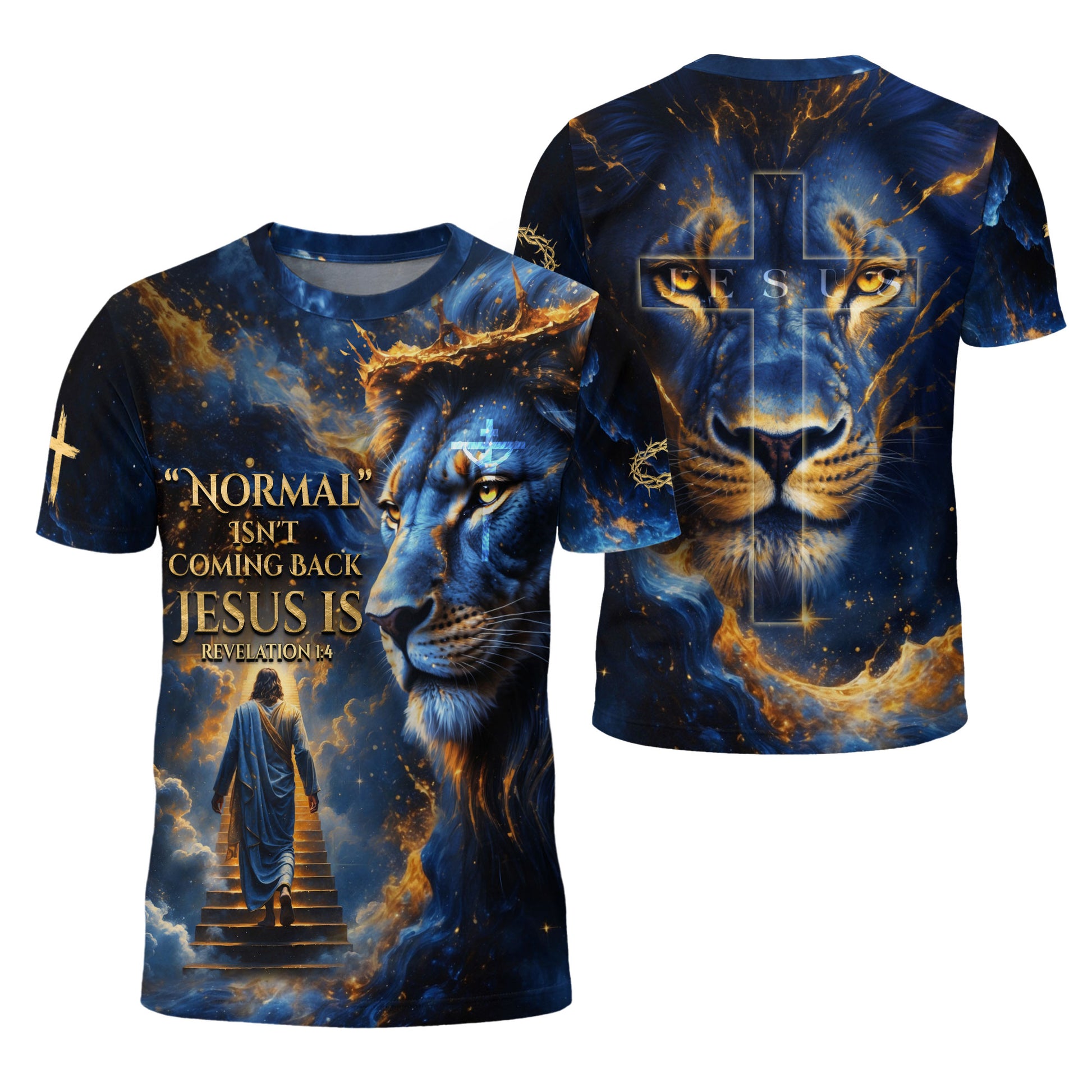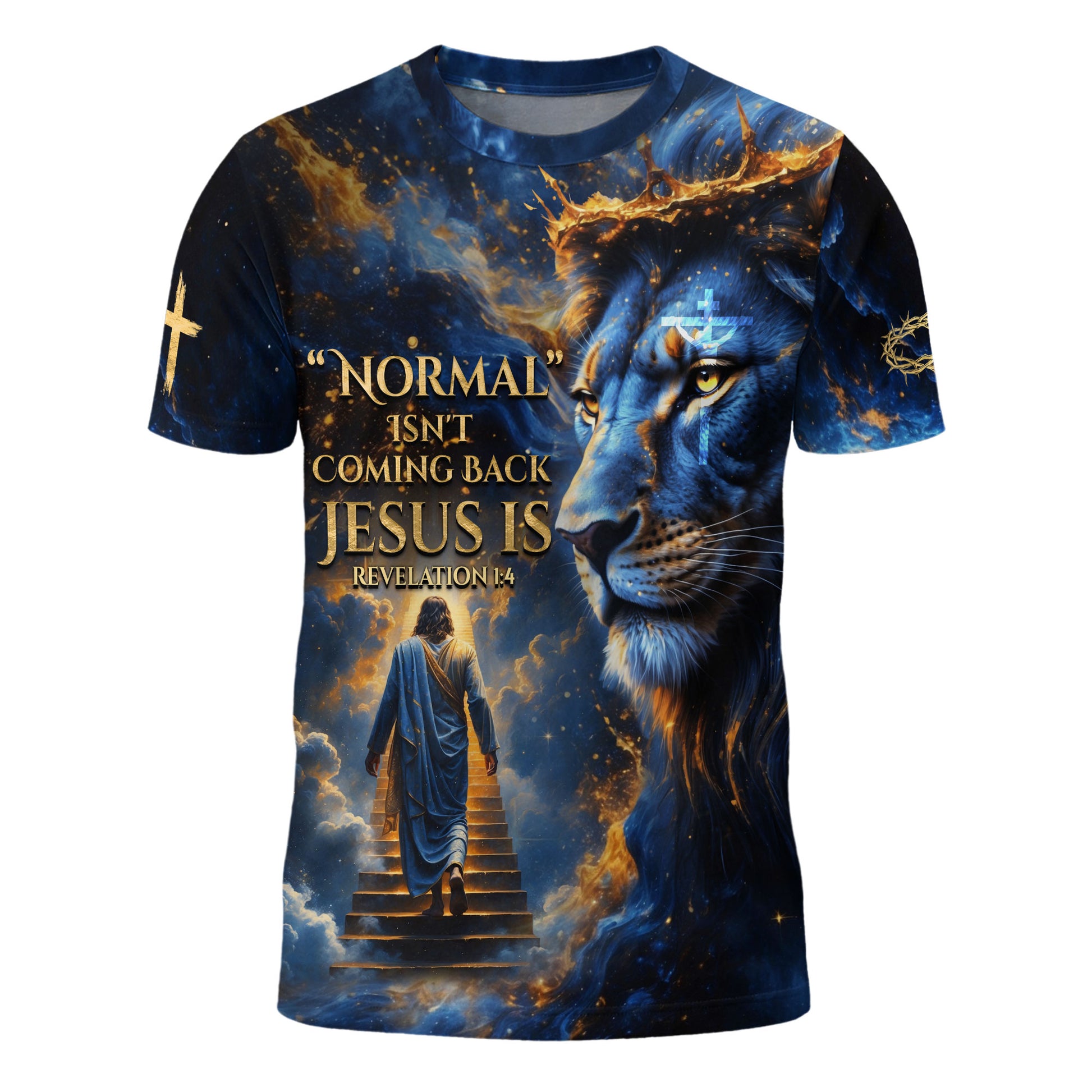 Bold Christian t-shirt inspired by Revelation 1:4 — “Normal isn’t coming back, Jesus is.” Featuring the majestic blue Lion of Judah and a radiant cross glowing with divine energy, this shirt symbolizes faith, prophecy, and hope for Christ’s return. Perfect for believers walking in strength and light.